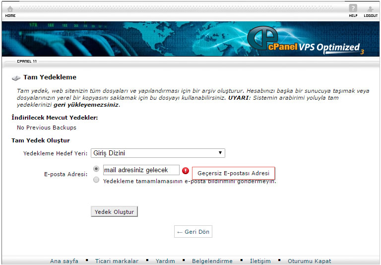 5) Yedek işlemi tamamlandığında e-posta bildirimi almak istiyorsanız e-posta adresinizi yazıp ” Yedek Oluştur ” butonuna tıklıyoruz.Eğer yedekleme işlemi tamamlandığında e-posta bildirimi almak istemiyorsanız bu alanı işaretleyiniz ve ” Yedek Oluştur ” butonuna tıklayınız .