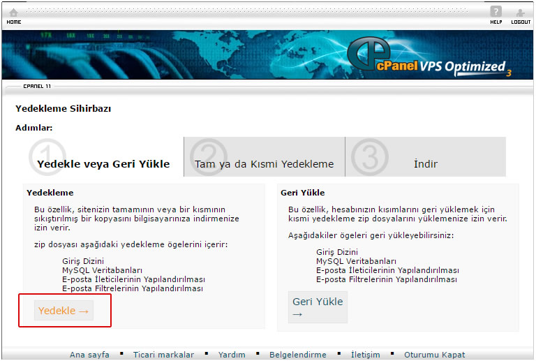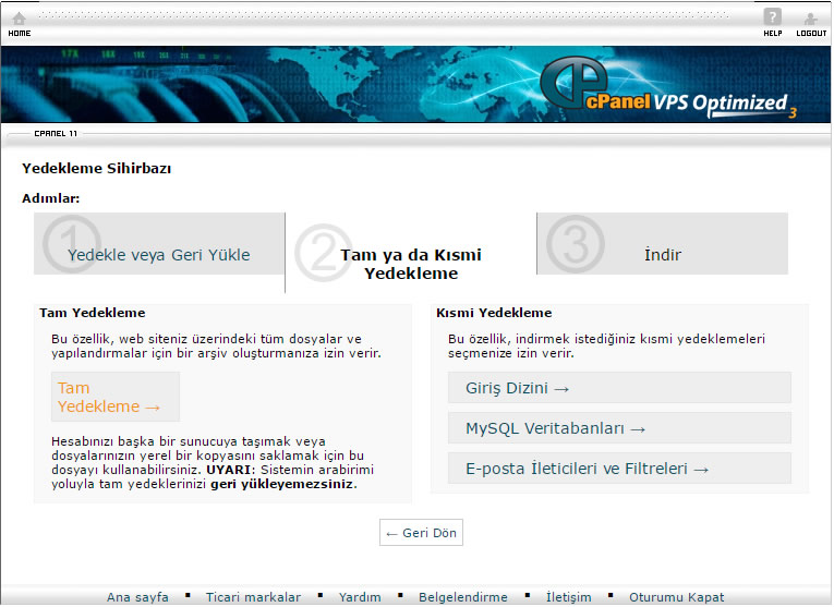4)Tam yedekleme butonuna basıyoruz.Eğer sadece giriş dizini, veritabanları , e-posta yedeklerinizi almak istiyorsanız kısmi yedekleme kısmından işleminize uygun bölümü seçip devam ediniz.