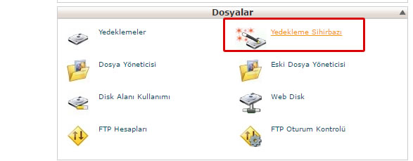 2)Açılan Cpanel sayfasında dosyalar/yedekleme Sihirbazı yollarını izliyoruz.