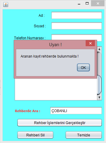 JOptionPane.showMessageDialog(null, "Aranan kayıt rehberde bulunmakta !", "Uyarı !", -1);}