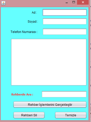 Öncelikle Jframe Form oluşturarak benzer rehber tasarımını oluşturunuz.Tasarım işlemini gerçekleştirirken form elemanlaınn name değerlerine dikkat ediniz.Tasarım işlemlerini gerçekleştirdikten sonra “Rehber İşlemlerini Gerçekleştir” butonunun içine tıklayarak gerekli kod alanına aşağıdaki kodları yazıyoruz.