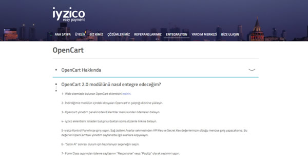 E-ticaret sistemimize iyzico eklentisini kurmak için öncelikle https://www.iyzico.com/entegrasyon/hazir-altyapi/opencart/ adresinden opencart sürümünüze uygun iyzico modülünü indiriyoruz.