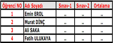 <?php $ogrenciler = array ( array ( adi => "Emin" , soyadi => " EROL", sinav1 =>"", sinav2 =>"", not =>""), array ( adi => "Murat", soyadi => "DİNÇ", sinav1 =>"", sinav2 =>"", not =>""), array ( adi => " Ali ", soyadi => " SAKA", sinav1 =>"", sinav2 =>"", not =>""), array ( adi => "Fatih", soyadi => "ULUKAYA", sinav1 =>"", sinav2 =>"", not =>"")); ?>