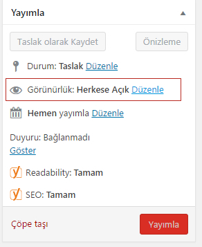 - Sağ üst kısımda çıkan “Yayımla” başlığı altında bulunan “Görünürlük : Herkese Açık ” kısmında “Düzenle” kısmına tıklayalım.
