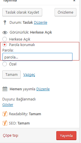 WordPress Şifre Korumalı Sayfa ve Yazı Oluşturma nasıl oluşturulur ? Oluşturduğunuz sayfaları ve yazıları sadece belli kullanıcılara açmak isteyebilirsiniz. Sadece yöneticilere özel bir sayfa veya yazıda oluşturabilirsiniz. WordPress Şifre Korumalı Sayfa ve Yazı Oluşturma gayet basit bir işlemdir. Yapmanız gereken ;